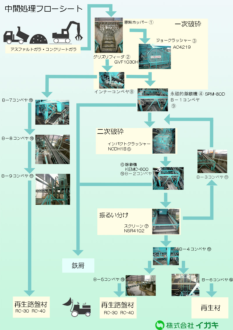 当社は産業廃棄物中間処分業者として、工事現場で発生する建設廃棄物(コンクリート廃材・アスファルト廃材)を破砕し、再生骨材・再生路盤材として再資源化を行っています。